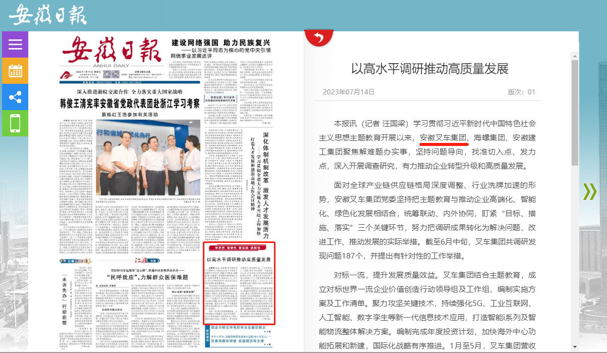 7月14日,《安徽日報》在頭版中就安徽叉車集團以高水平調(diào)研推動高質(zhì)量發(fā)展情況進(jìn)行了報道。報道中表示,學(xué)習(xí)貫徹習(xí)近平新時代中國特色社會主義思想主題教育開展以來,安徽叉車集團聚焦解難題辦實事,堅持問題導(dǎo)向,找準(zhǔn)切入點、發(fā)力點,深入開展調(diào)查研究,有力...